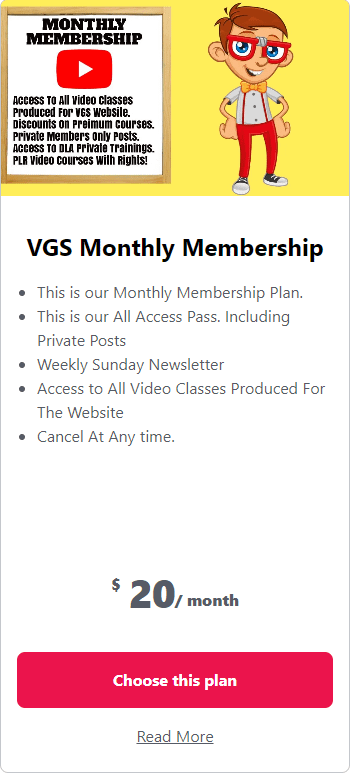The VGS Monthly Membership is priced at an affordable $20 per month, offering exceptional value for the extensive resources and benefits included.