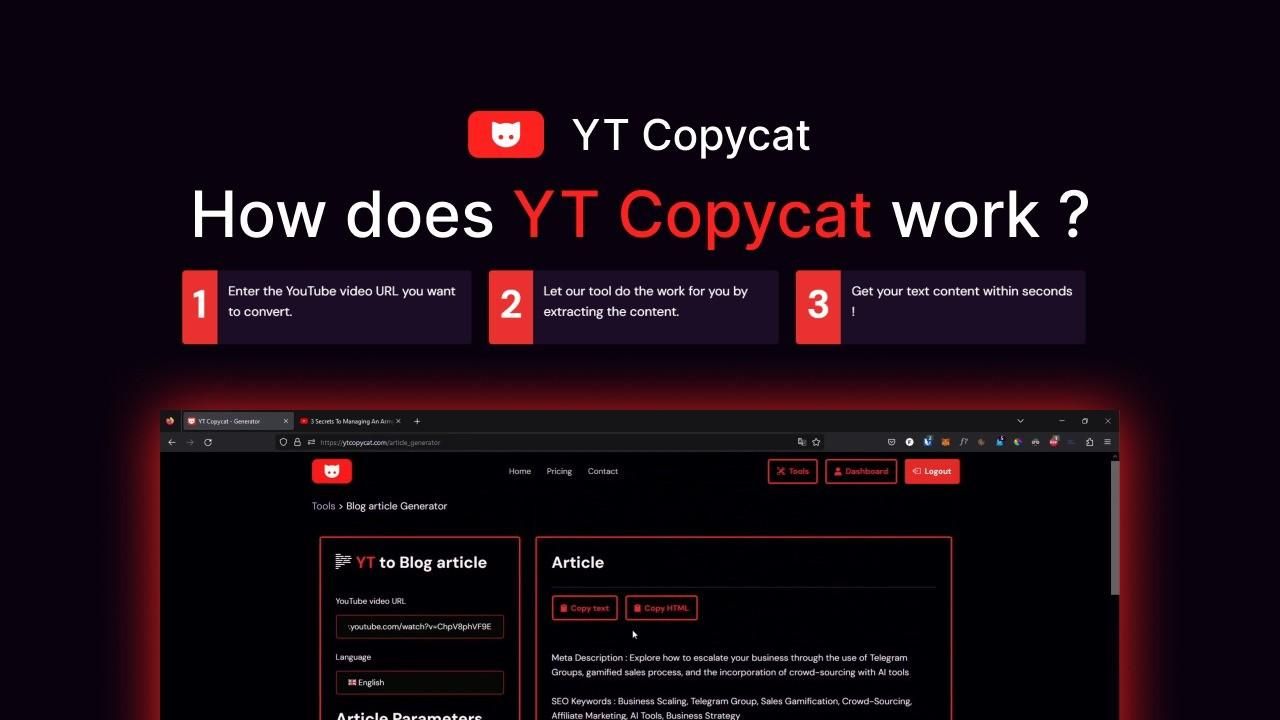 YT Copycat is a cutting-edge content creation tool that breathes new life into your existing video content. By harnessing the capabilities of advanced AI models like GPT-3 and GPT-4, this innovative tool empowers you to seamlessly convert YouTube videos into a diverse range of written content, including blog articles, tweets, and SEO-rich newsletters. The ability to automate WordPress publishing further simplifies the distribution of your content, saving you valuable time and effort.